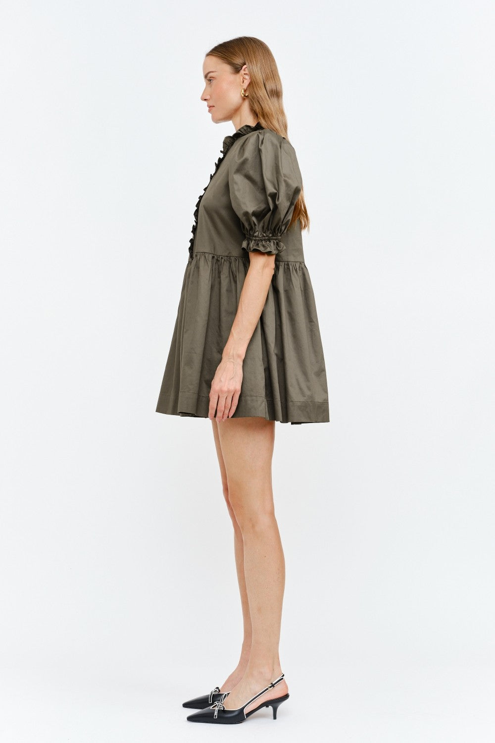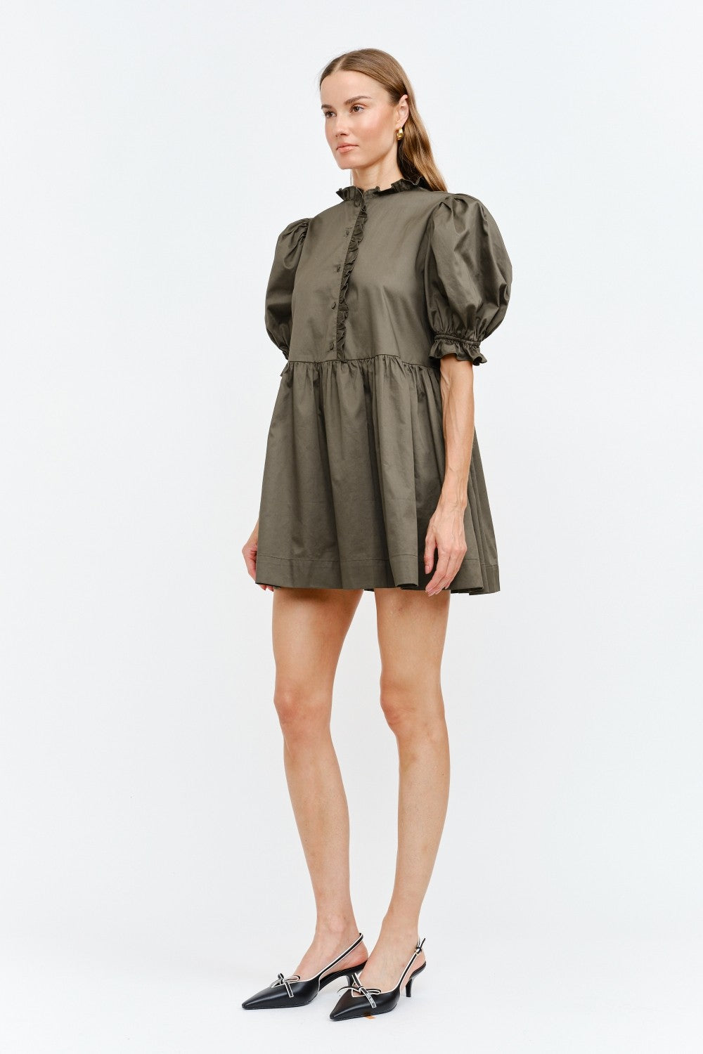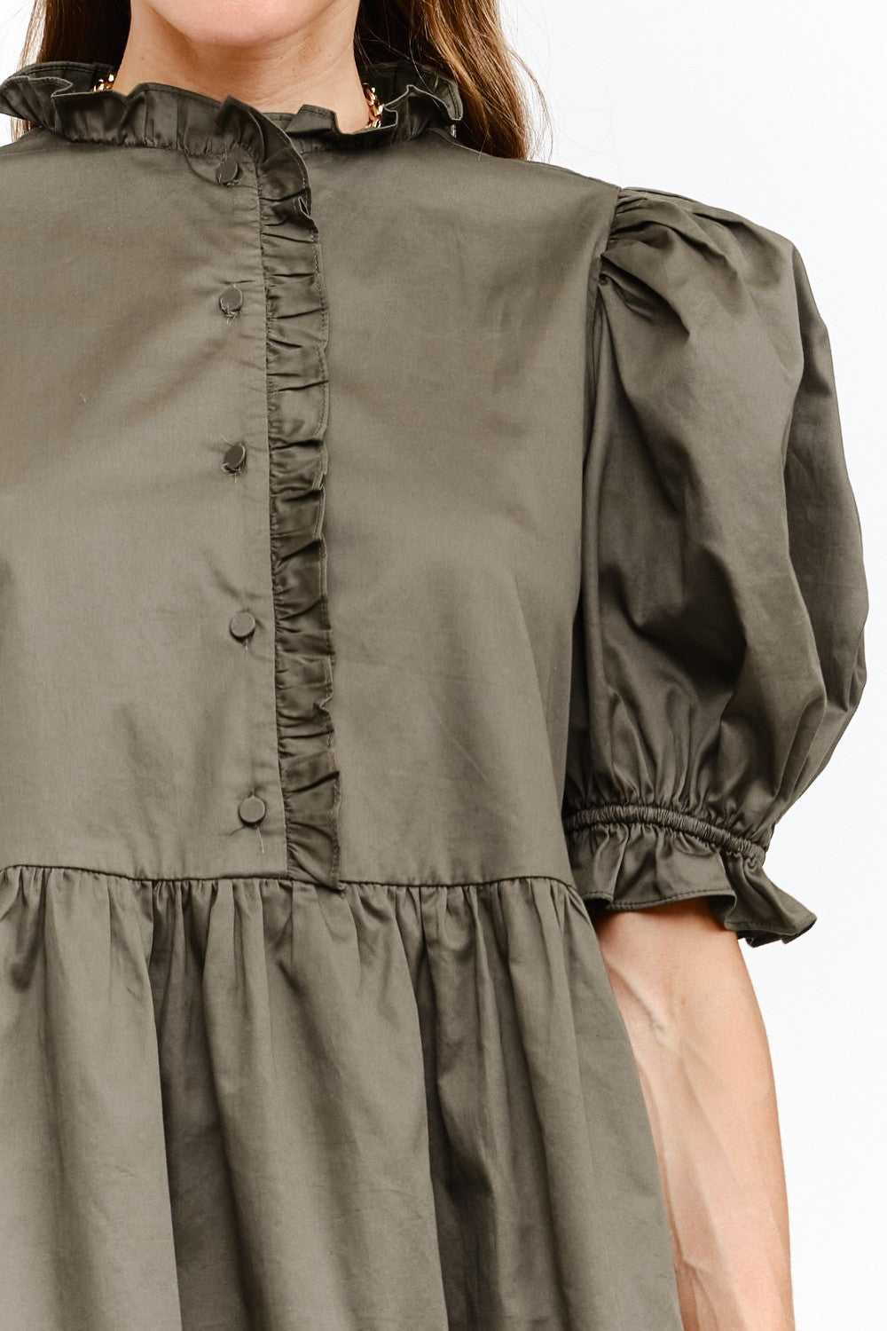 Dark Olive Brown Poplin Puff Sleeve Babydoll Dress