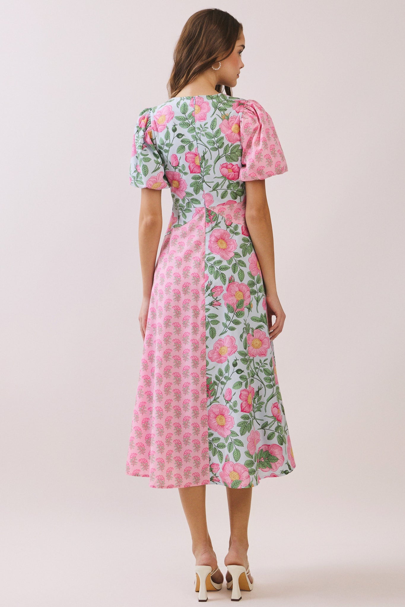 SPRING 2026 Pink Floral Color Block Midi Dress