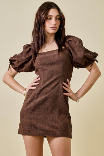 NEWEST ARRIVAL Brown Corduroy Puff Sleeve Mini Dress