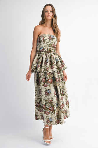 NEWEST ARRIVAL Fall Taupe Floral Tapestry Strapless Midi Dress