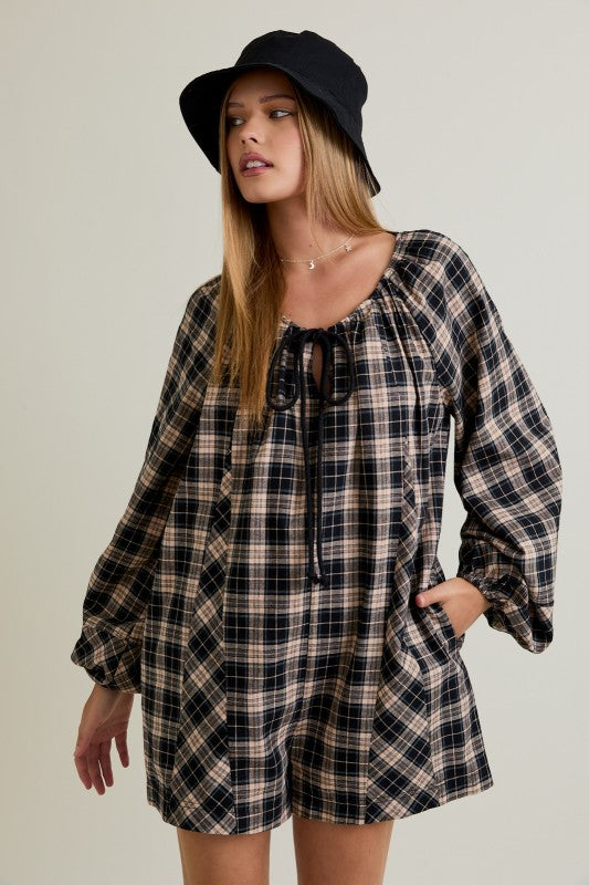 NEWEST ARRIVAL Black Plaid Long Sleeve Romper