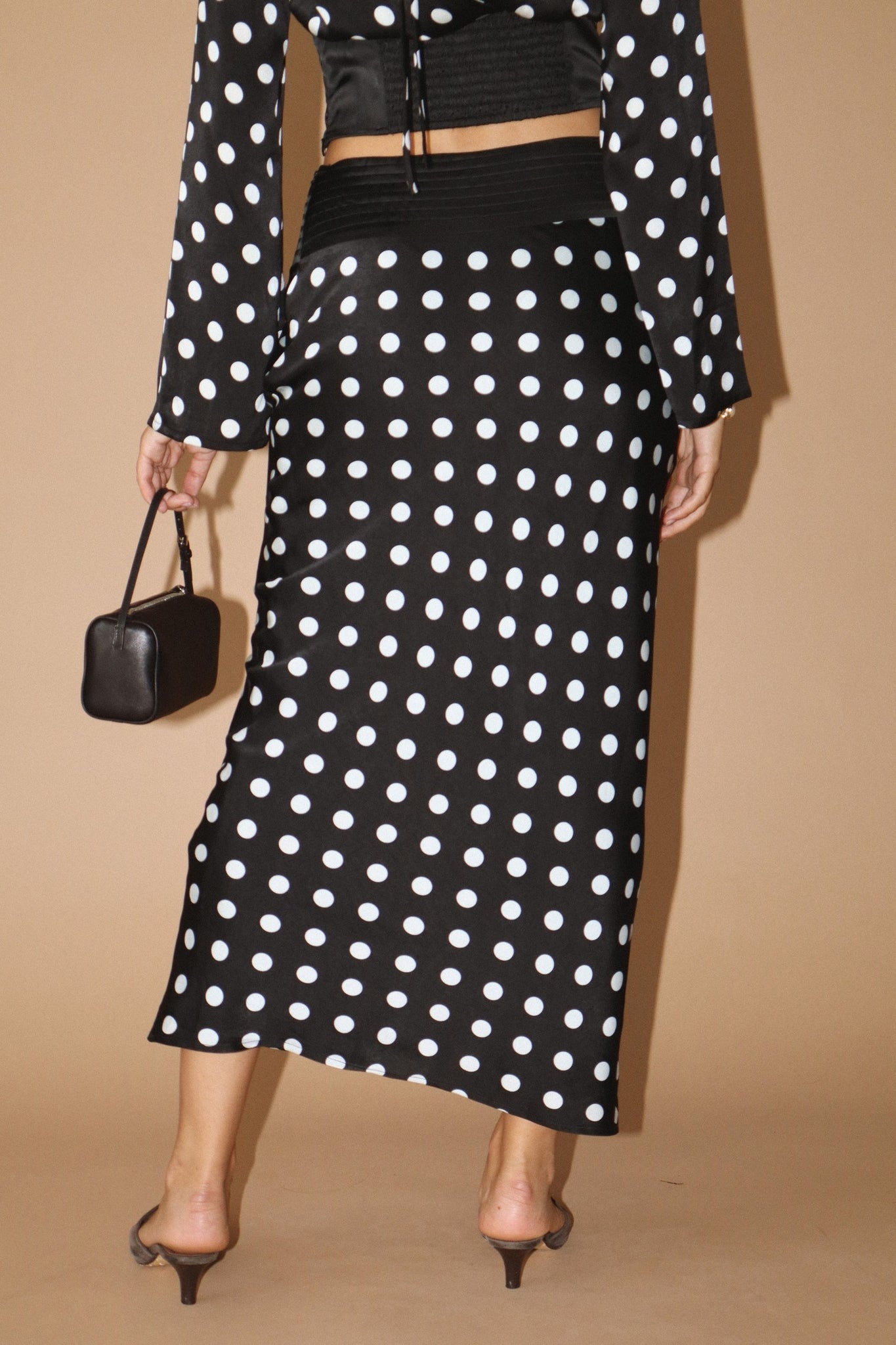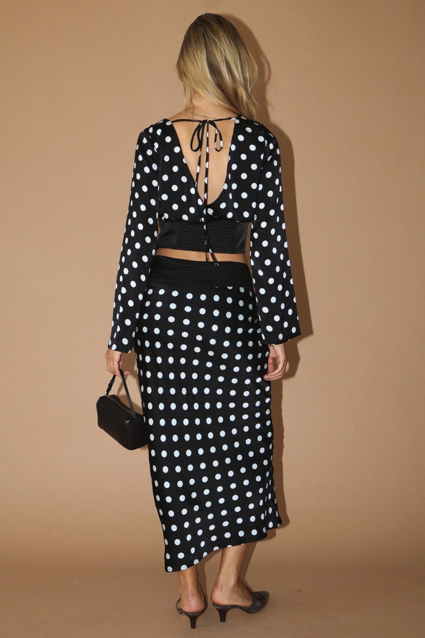 NEWEST ARRIVAL Black Satin Long Sleeve Polka Dot Midi Skirt Set