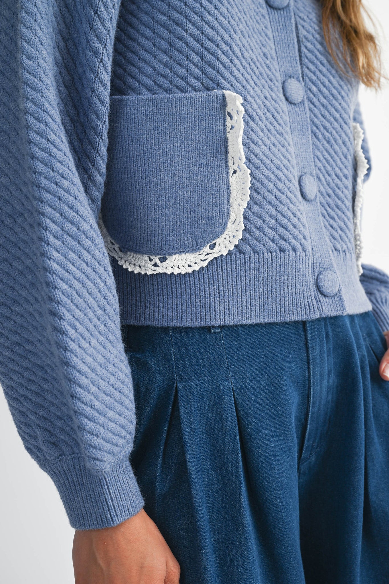 Blue Denim Quilted Peter Pan Collar Cardigan