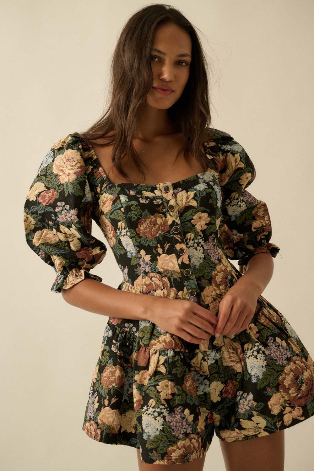 Floral Jacquard Puff Sleeve Romper