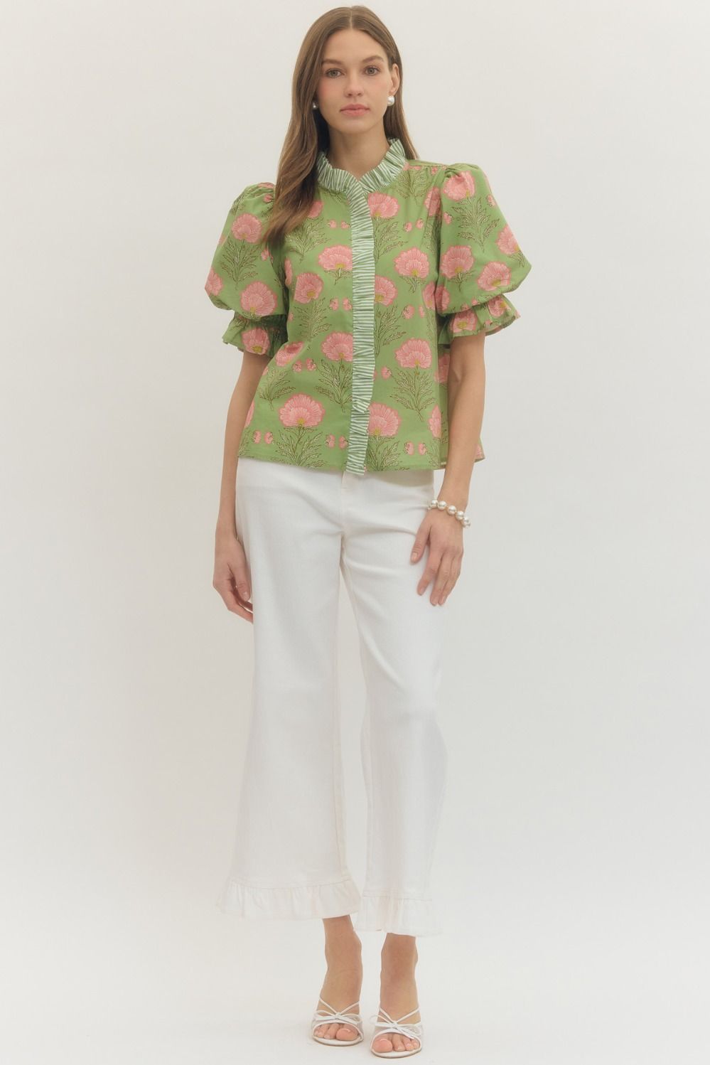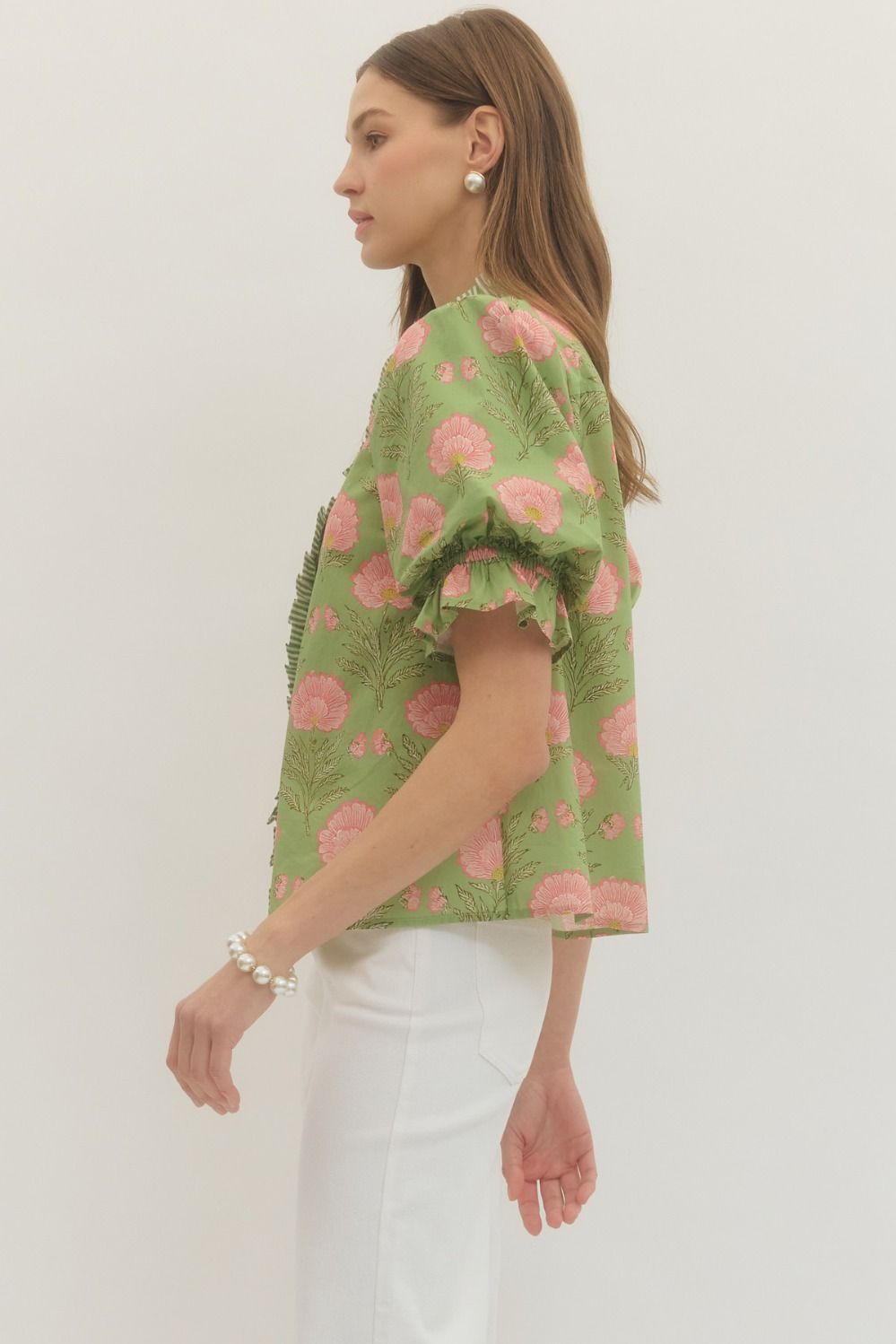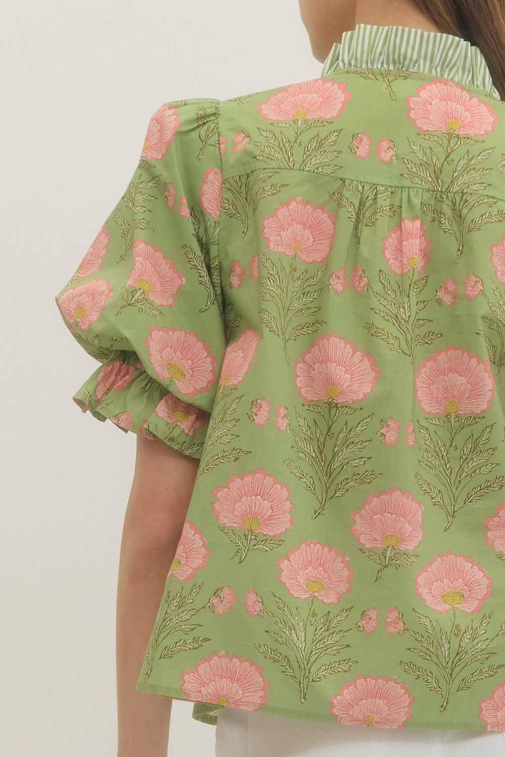 NEWEST ARRIVAL Matcha Green/Pink Floral Puff Sleeve Blouse