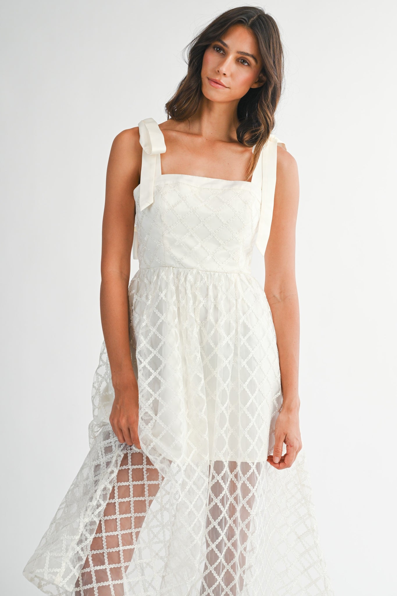 NEWEST ARRIVAL Off White Satin Sheer Embroidered Overlay Midi Dress