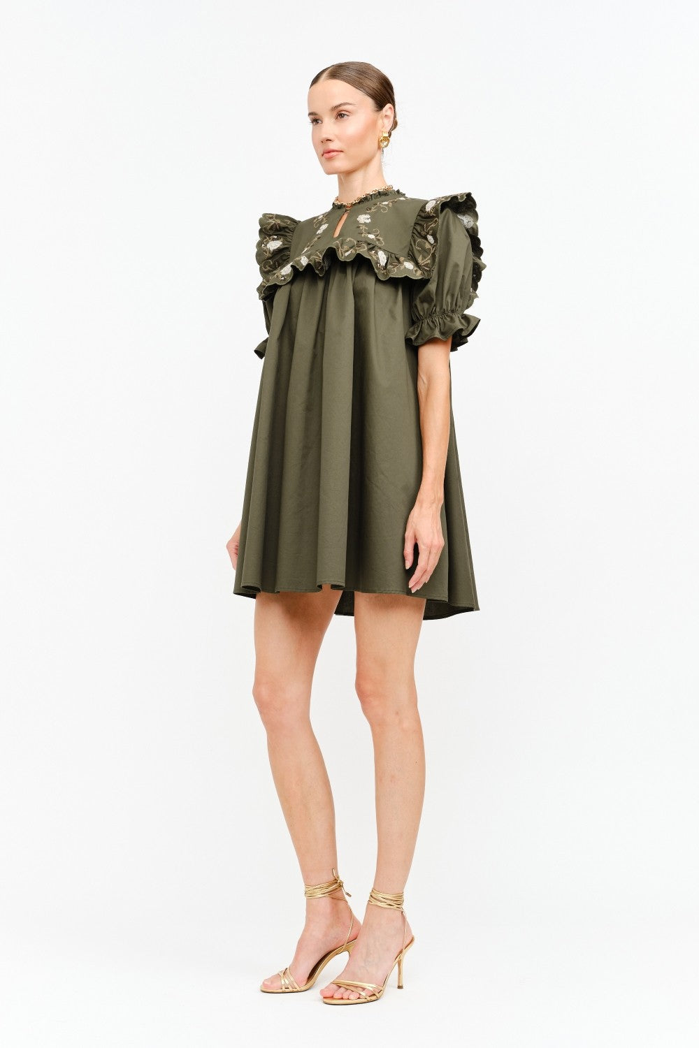 NEWEST ARRIVAL Olive Green Poplin Embroidered Babydoll Dress
