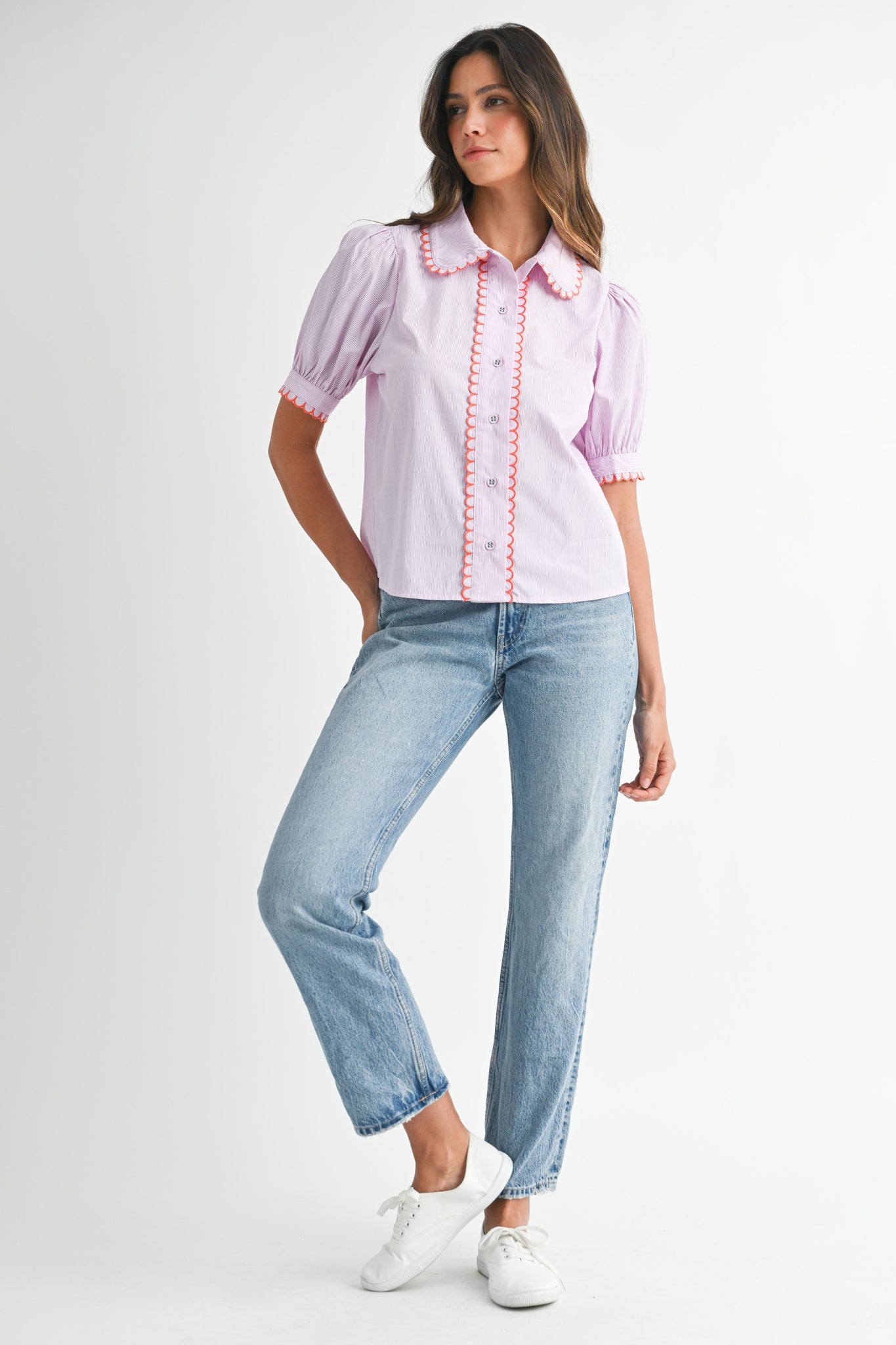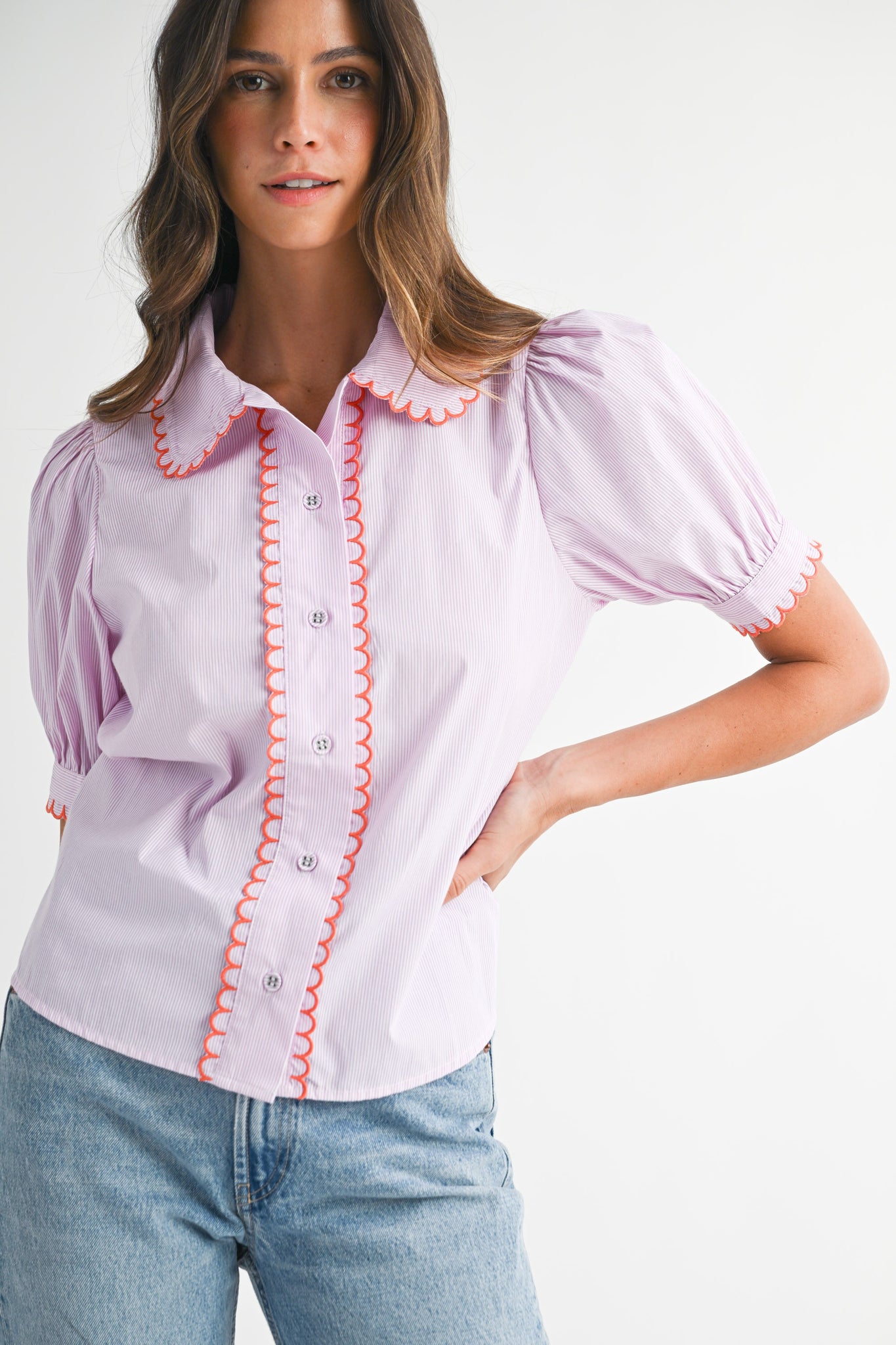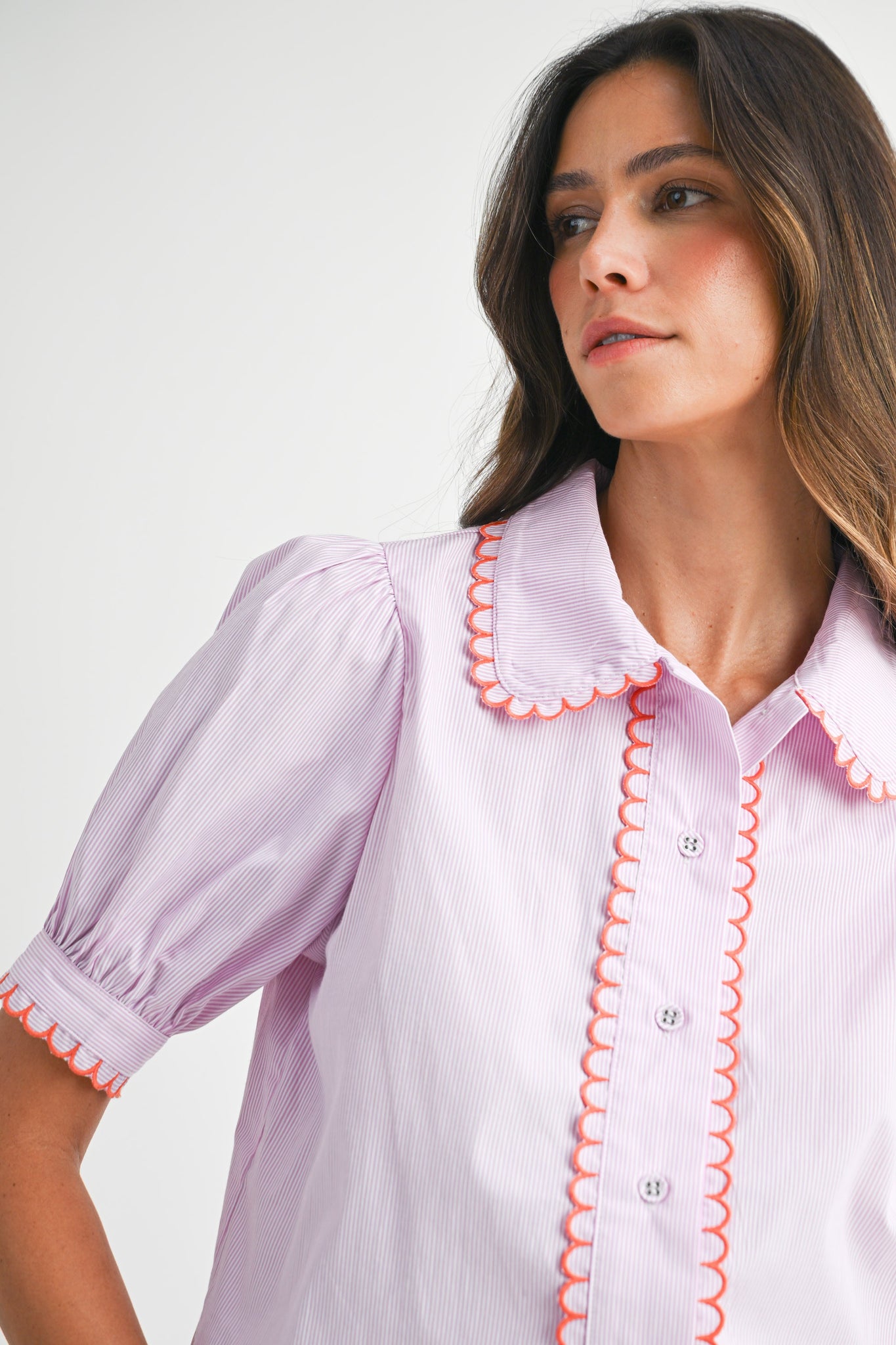 NEWEST ARRIVAL Pink Striped Scallop Trim Button Down Blouse