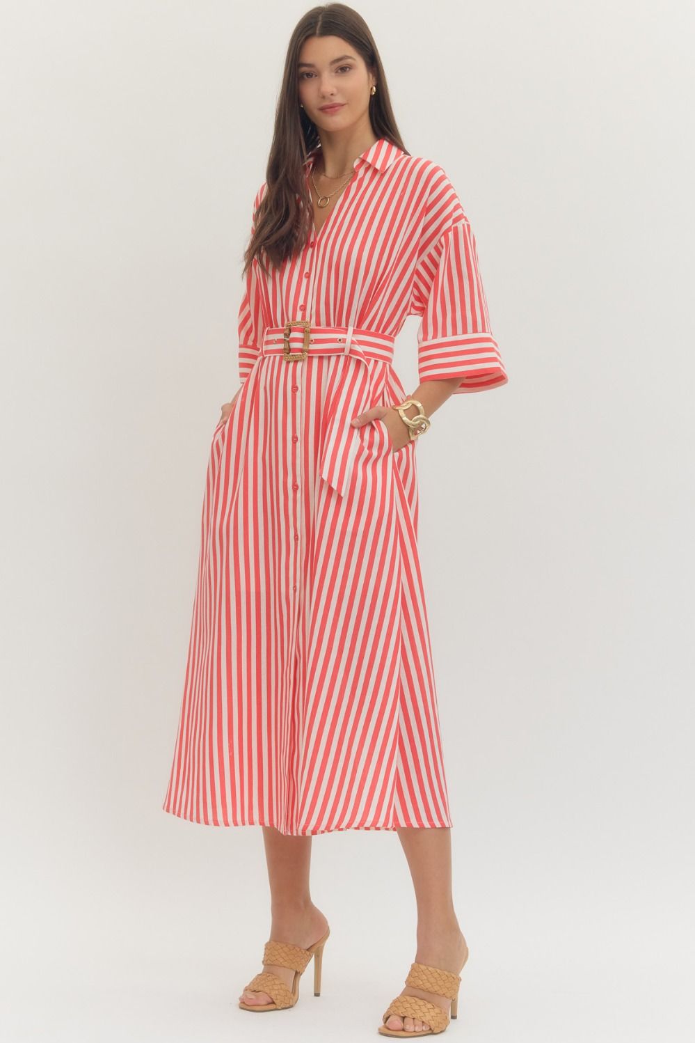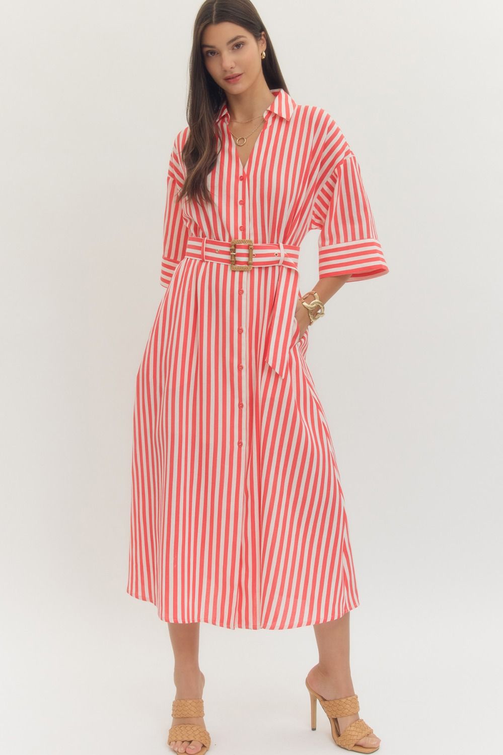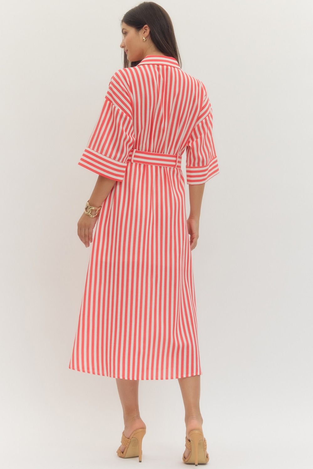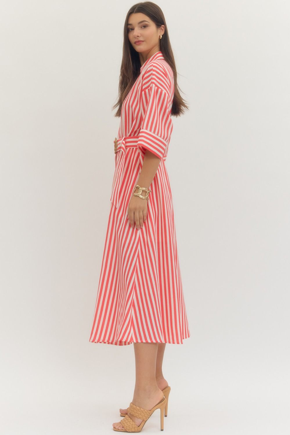 NEWEST ARRIVAL Red Striped Half Sleeve Midi Dress