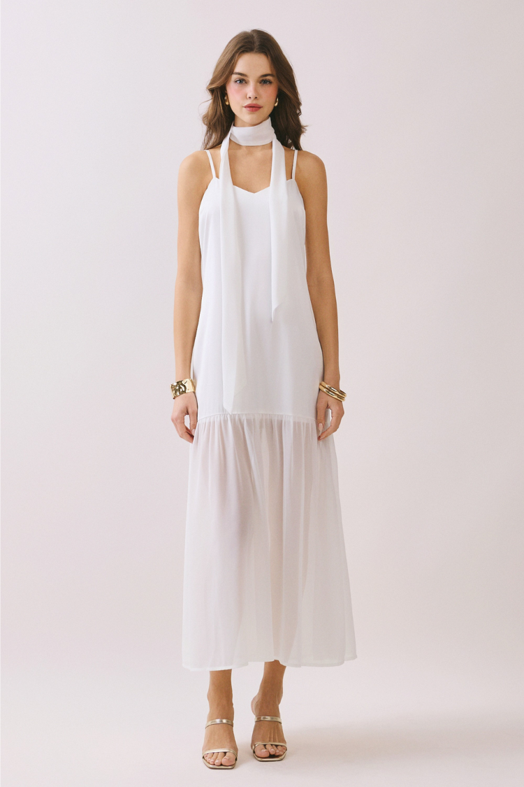 White Neck Scarf Chiffon Maxi Dress
