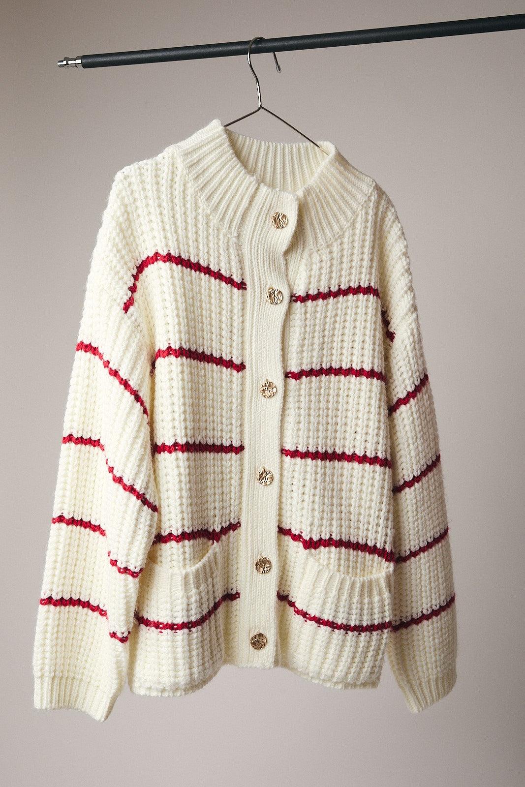 Cream/Red Striped Oversized Cozy Mock Neck Cardigan