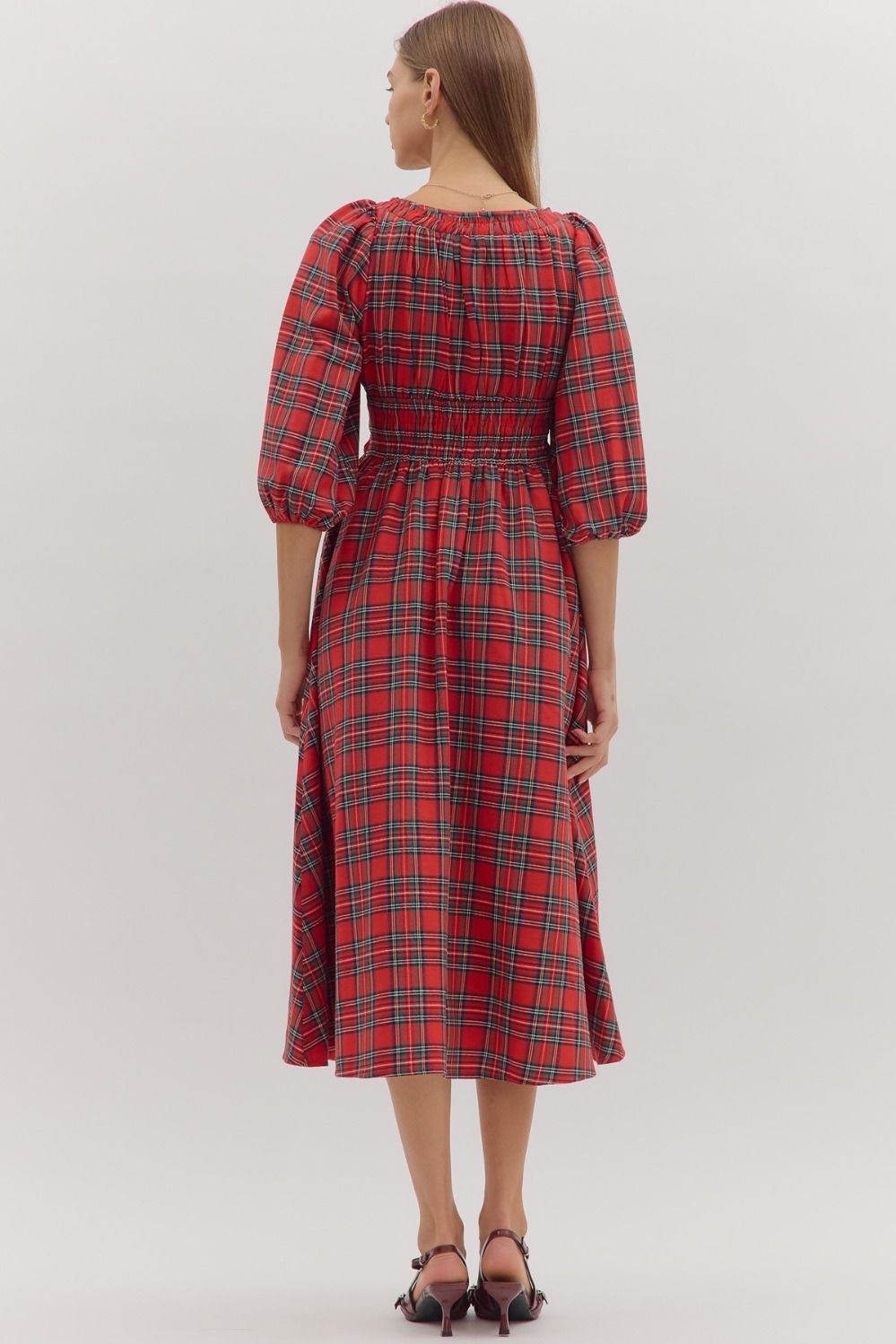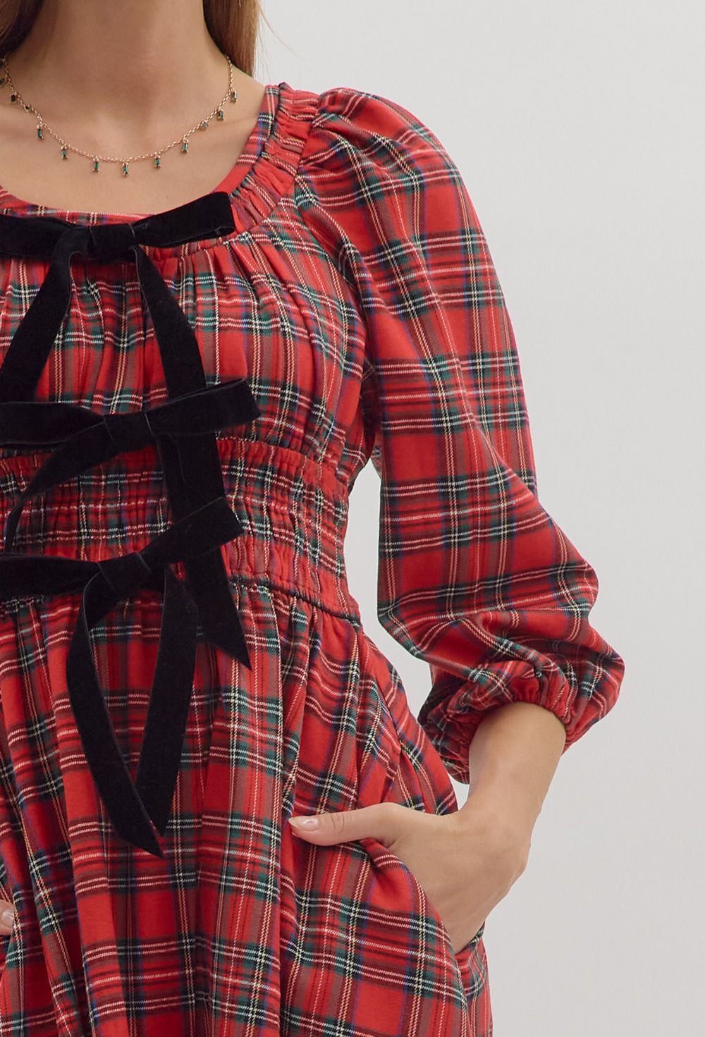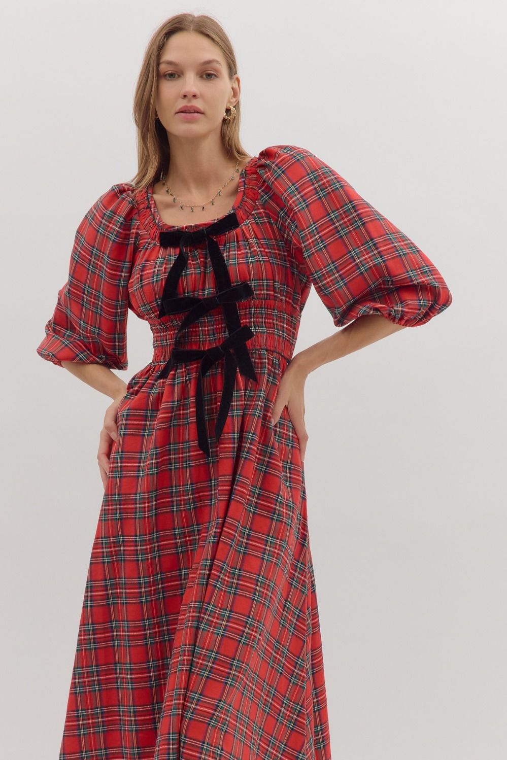 NEWEST ARRIVAL LAST ONE Red Christmas Plaid Black Bow Midi Dress