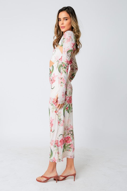 FINAL SALE Off White Floral Mesh Bodycon Midi Dress
