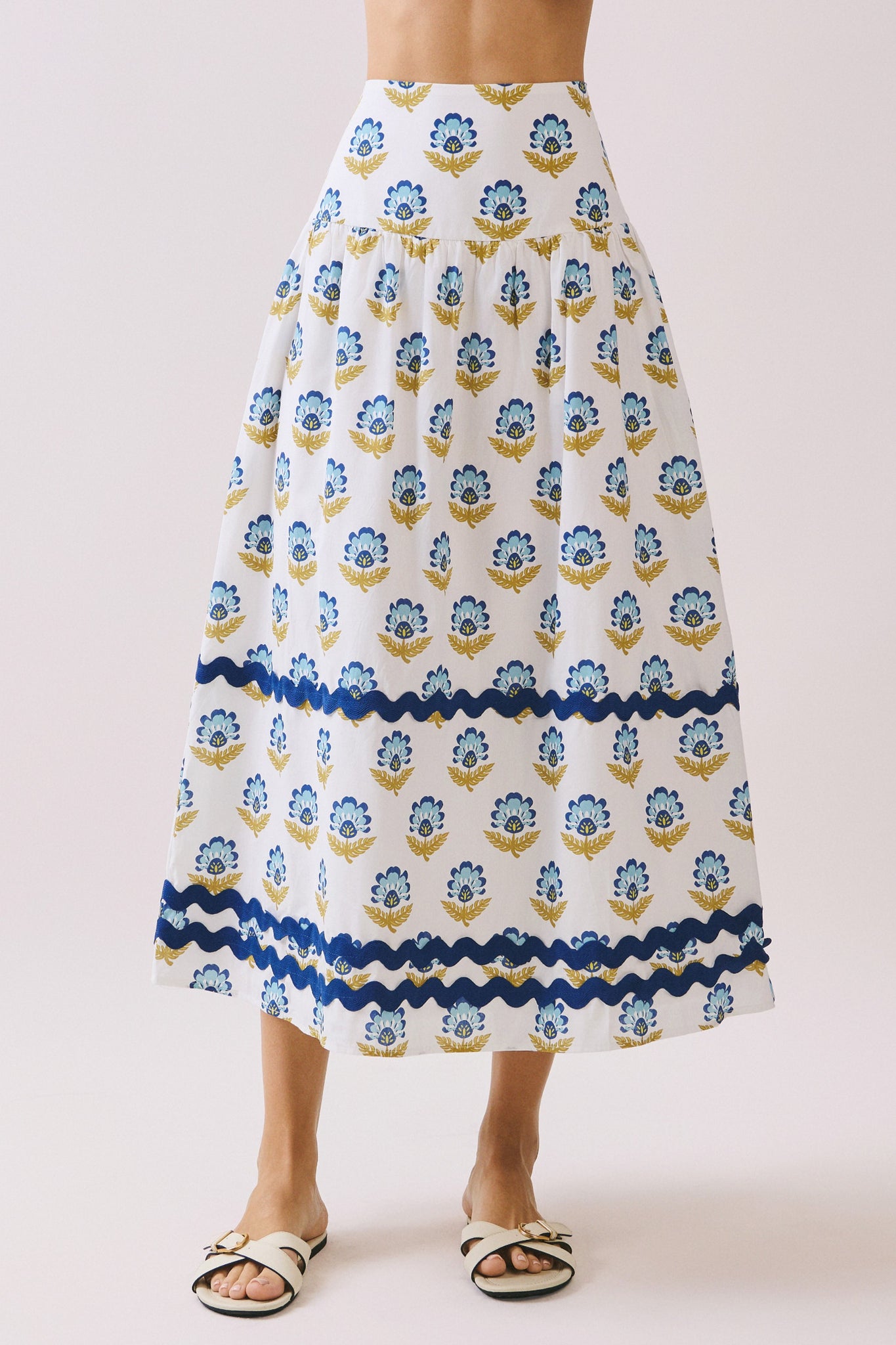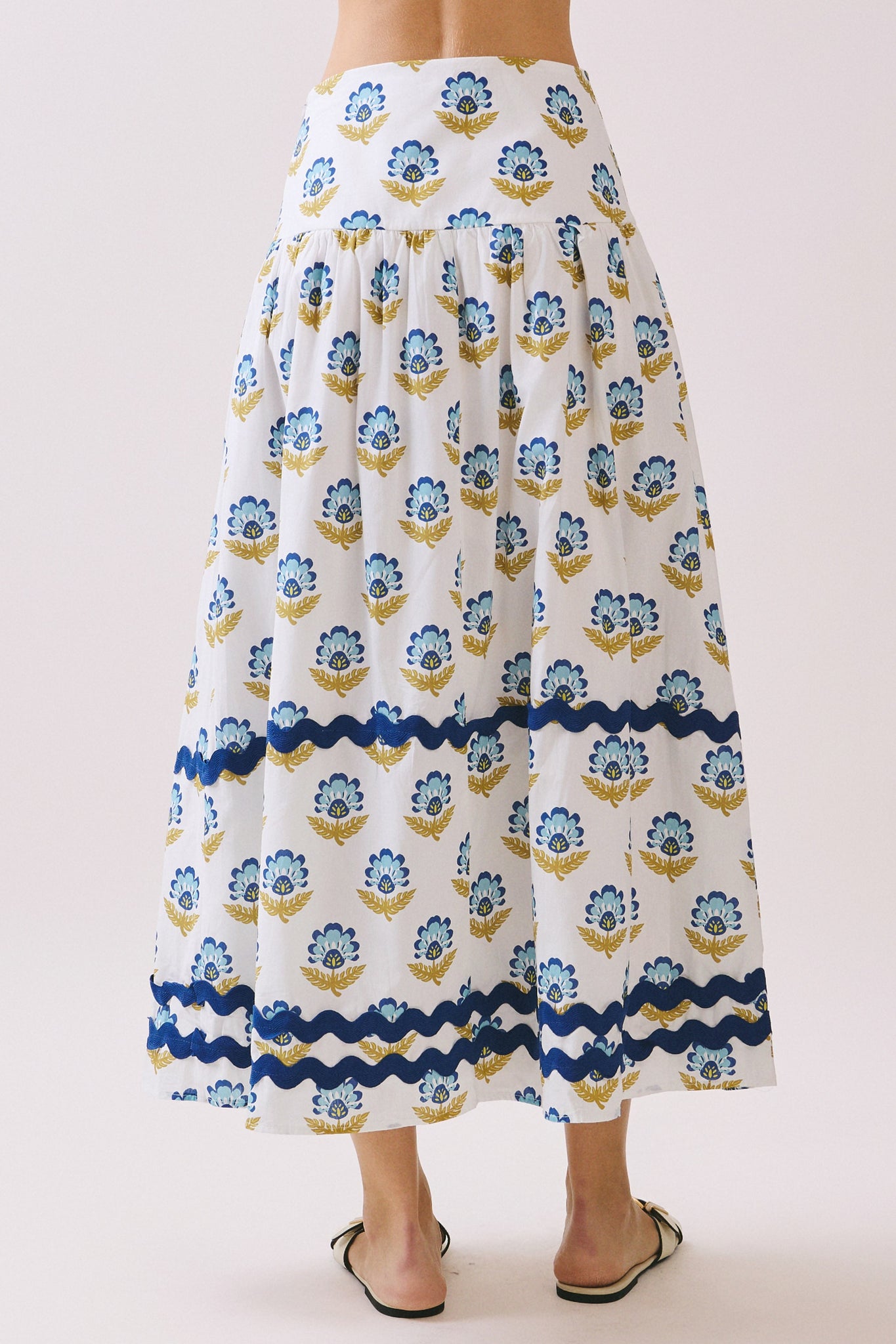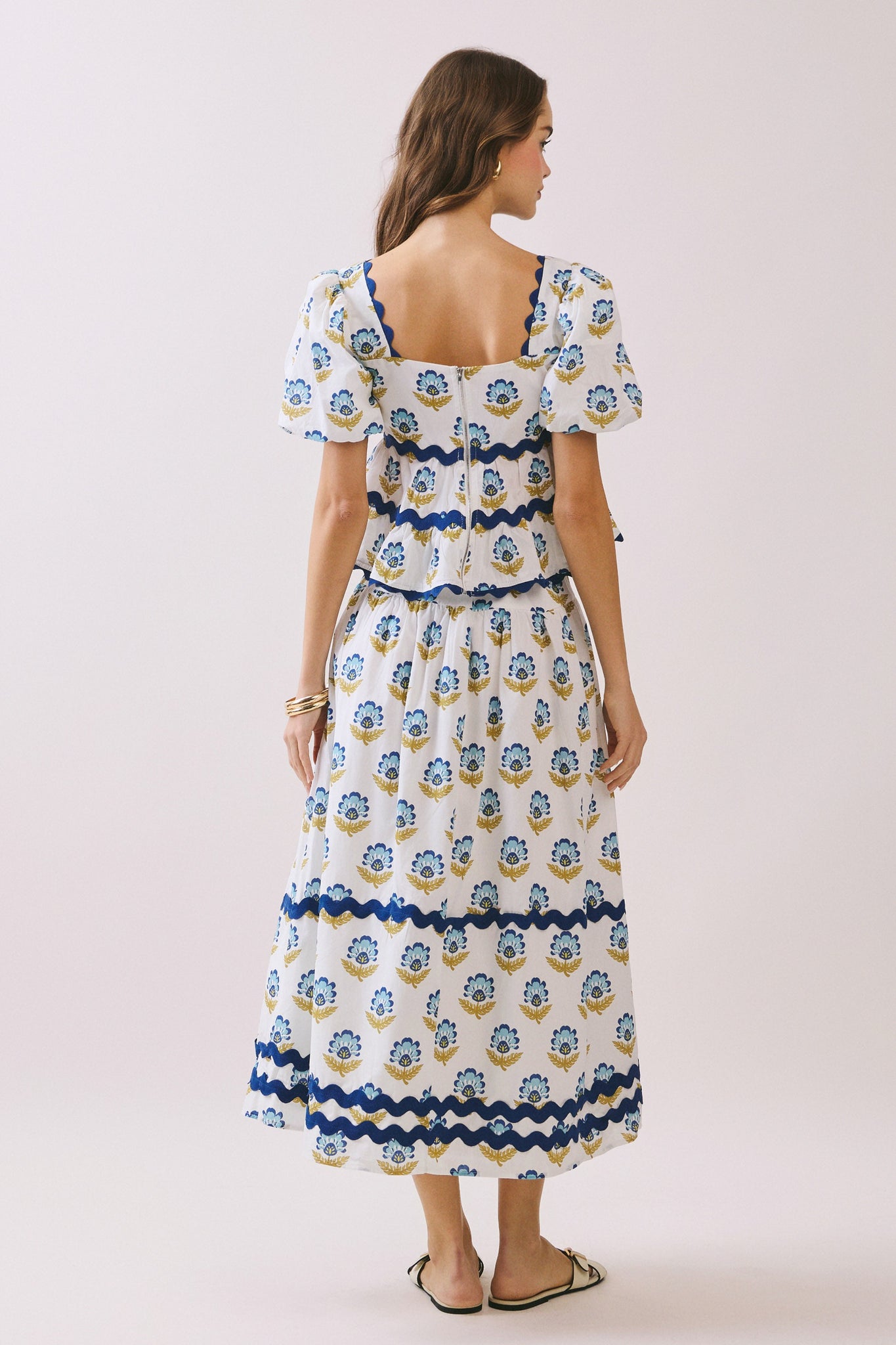 Off White Blue Floral Print Ric Rac Midi Skirt Set
