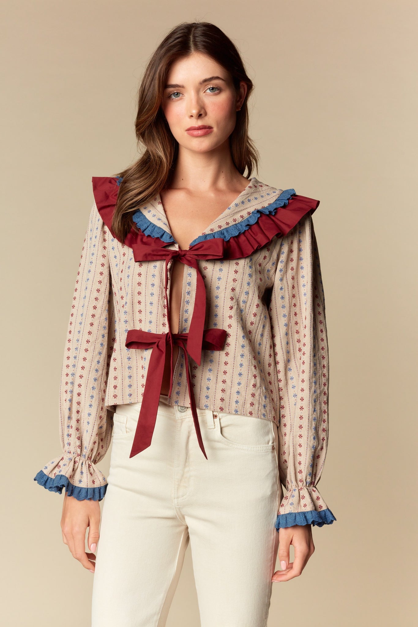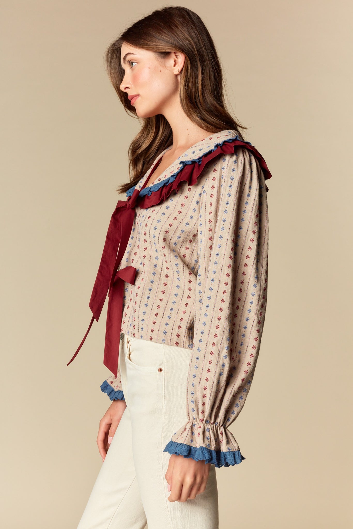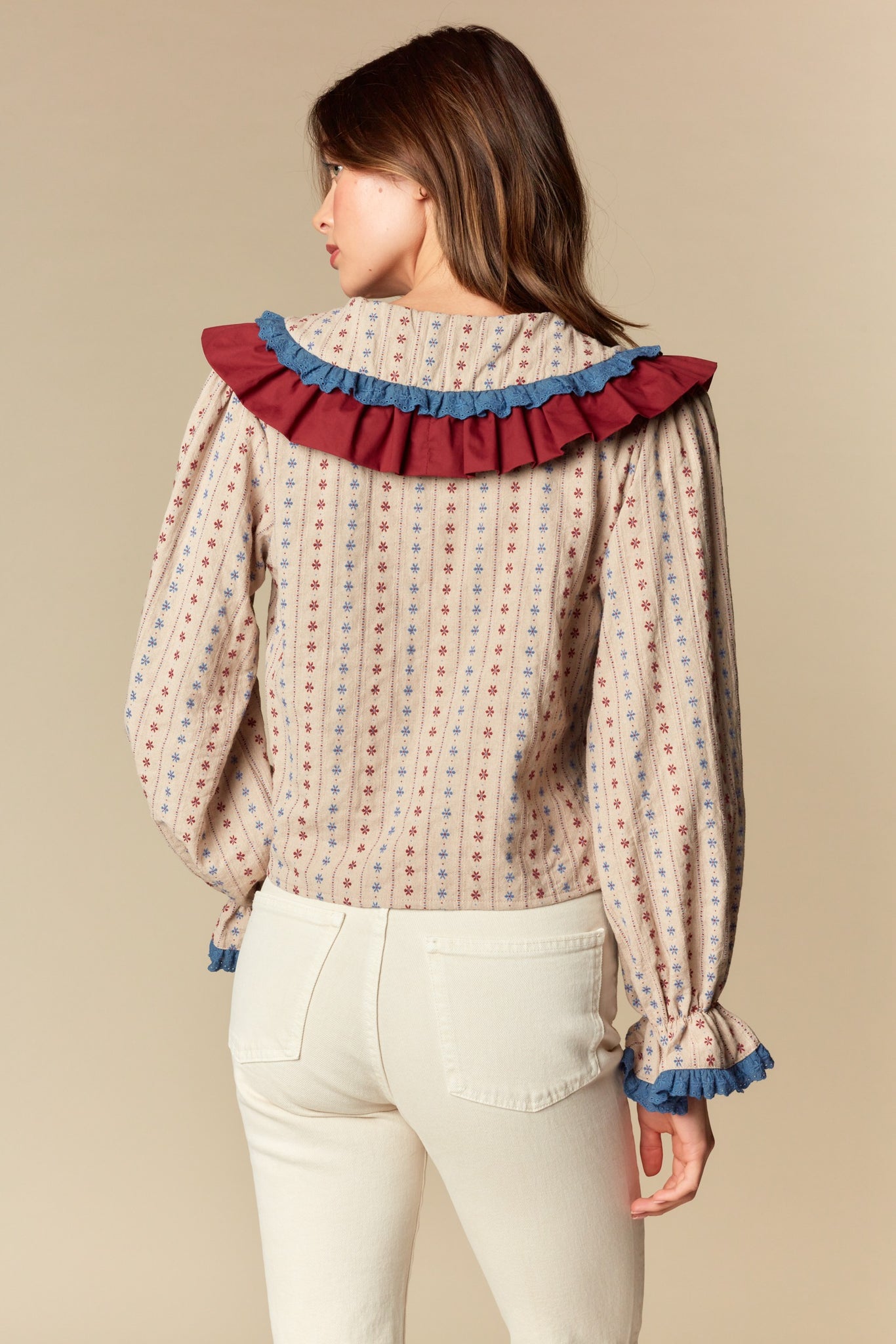 Taupe Burgundy Floral Ruffle Blouse