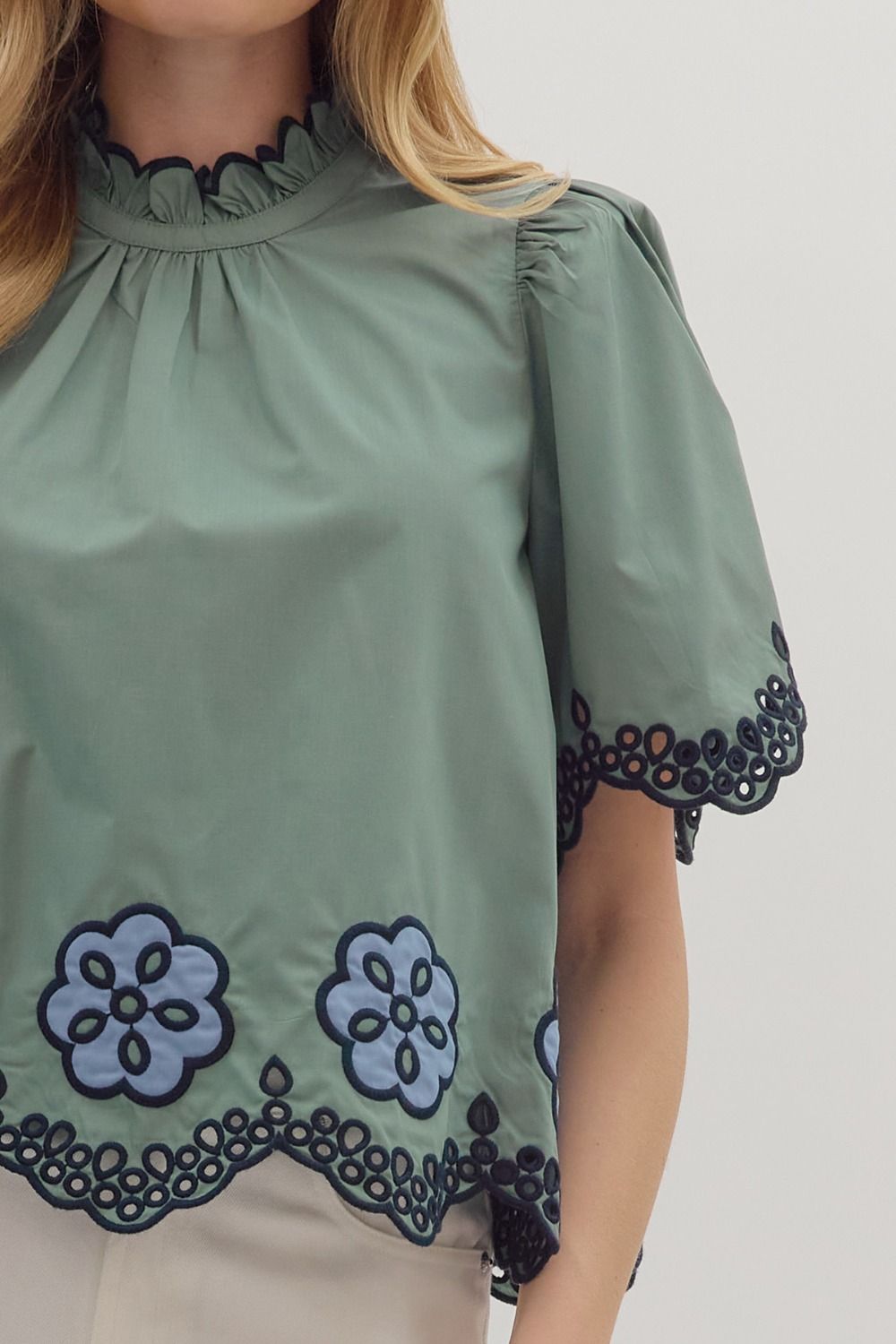 NEWEST ARRIVAL Sage Green/Navy Embroidered Mock Neck Blouse