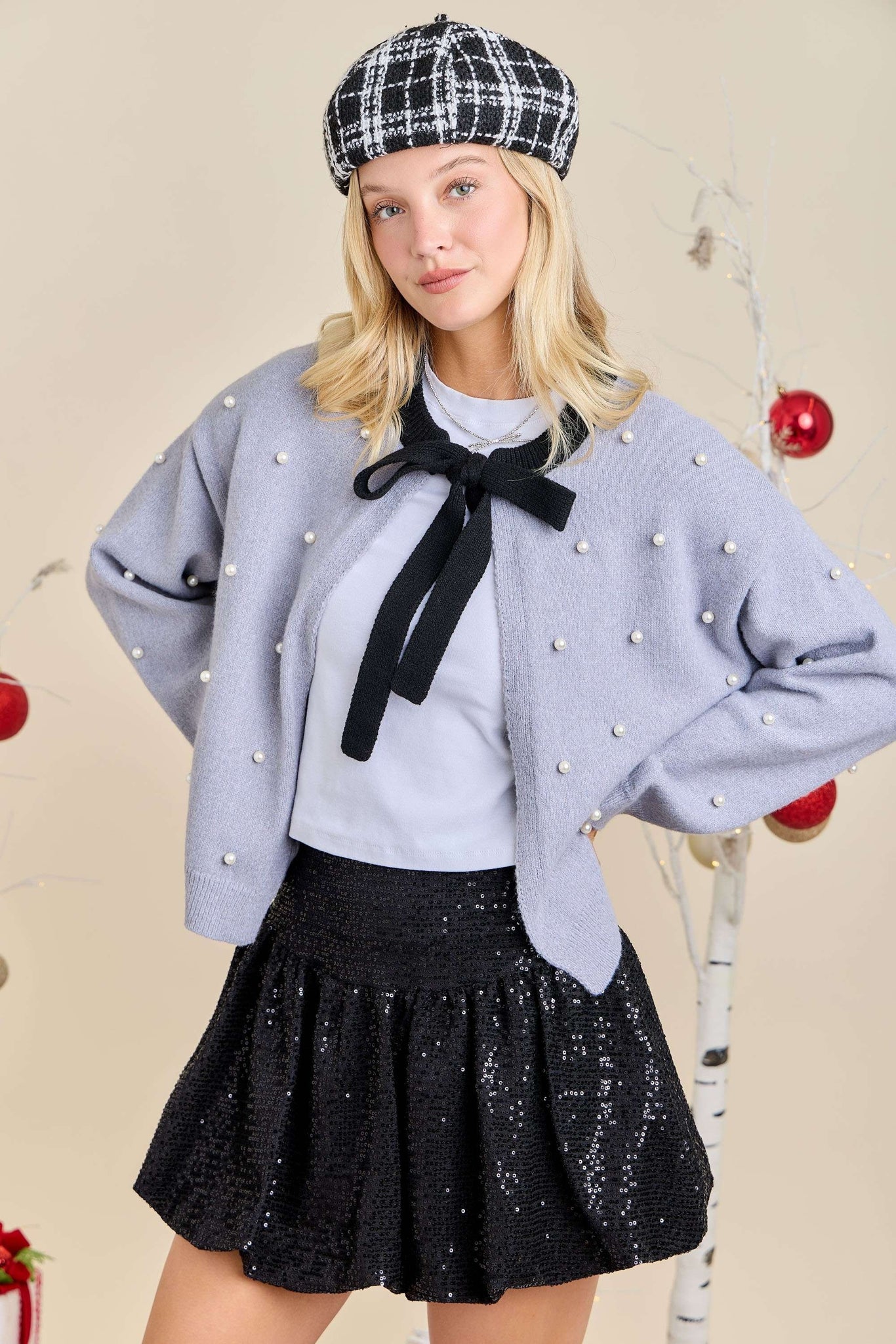 Gray/Black Neck Tie Pearl Cardigan