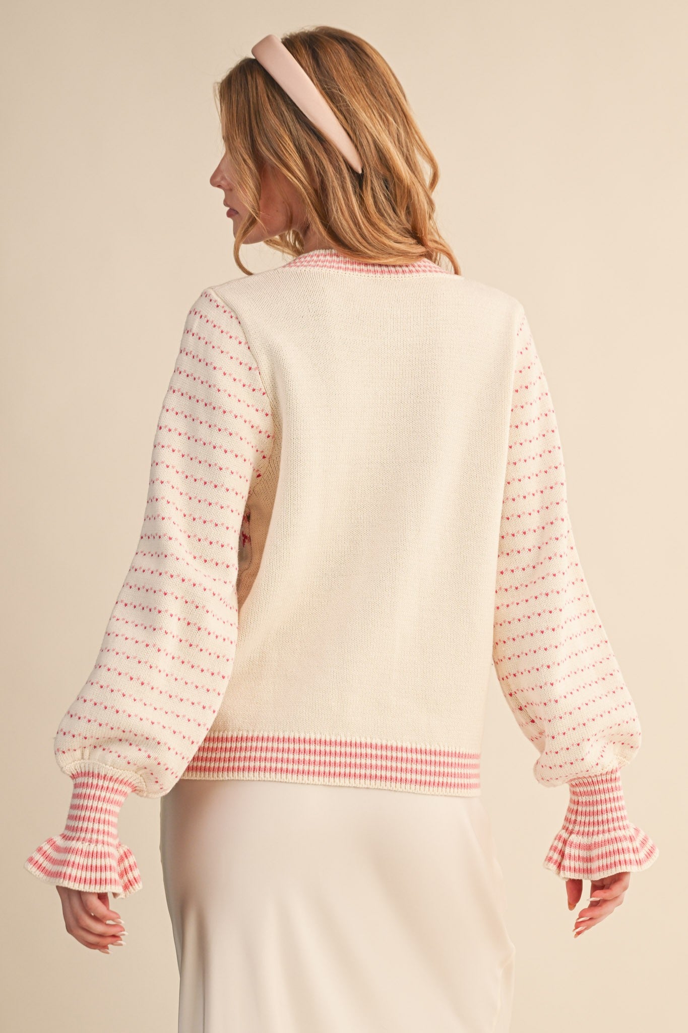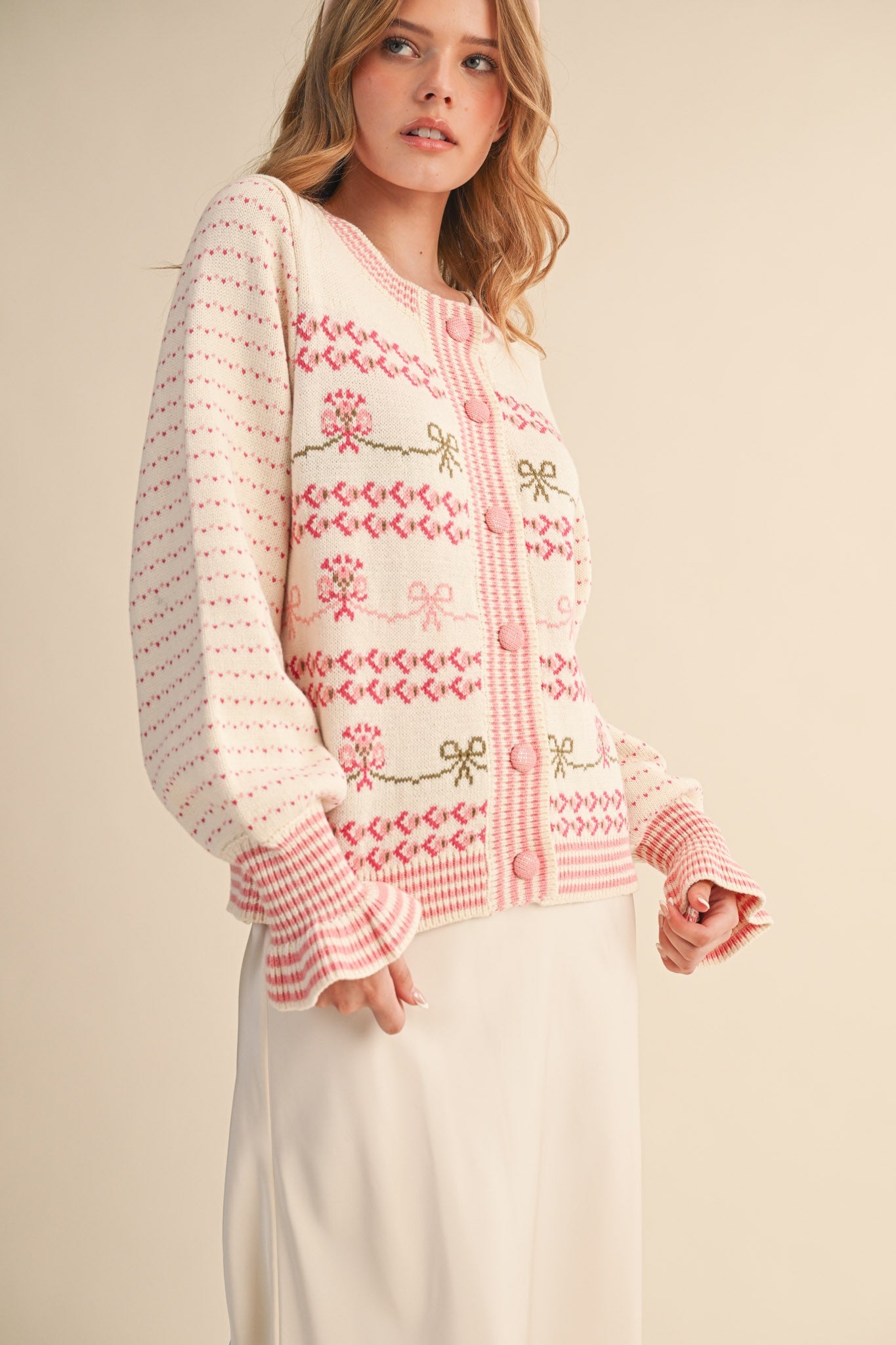 Ivory/Pink FloralBow Cardigan Sweater