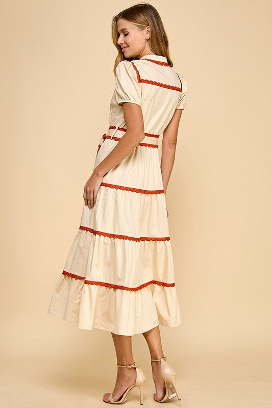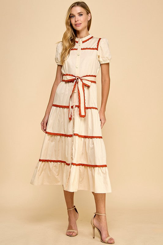 Cream/Burnt Red Scallop Trim Button Down Midi Dress